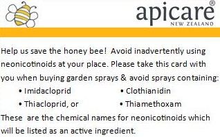 While the topic of bee safe sprays is relevant topic it is also one that can also be rather confusing. There are so many different garden sprays available in the market place and so many different chemical names, brand names and generic names that making a considered choice can seem impossible. We have tried to simply the issue below by providing some brand names commonly available in the New Zealand market place.